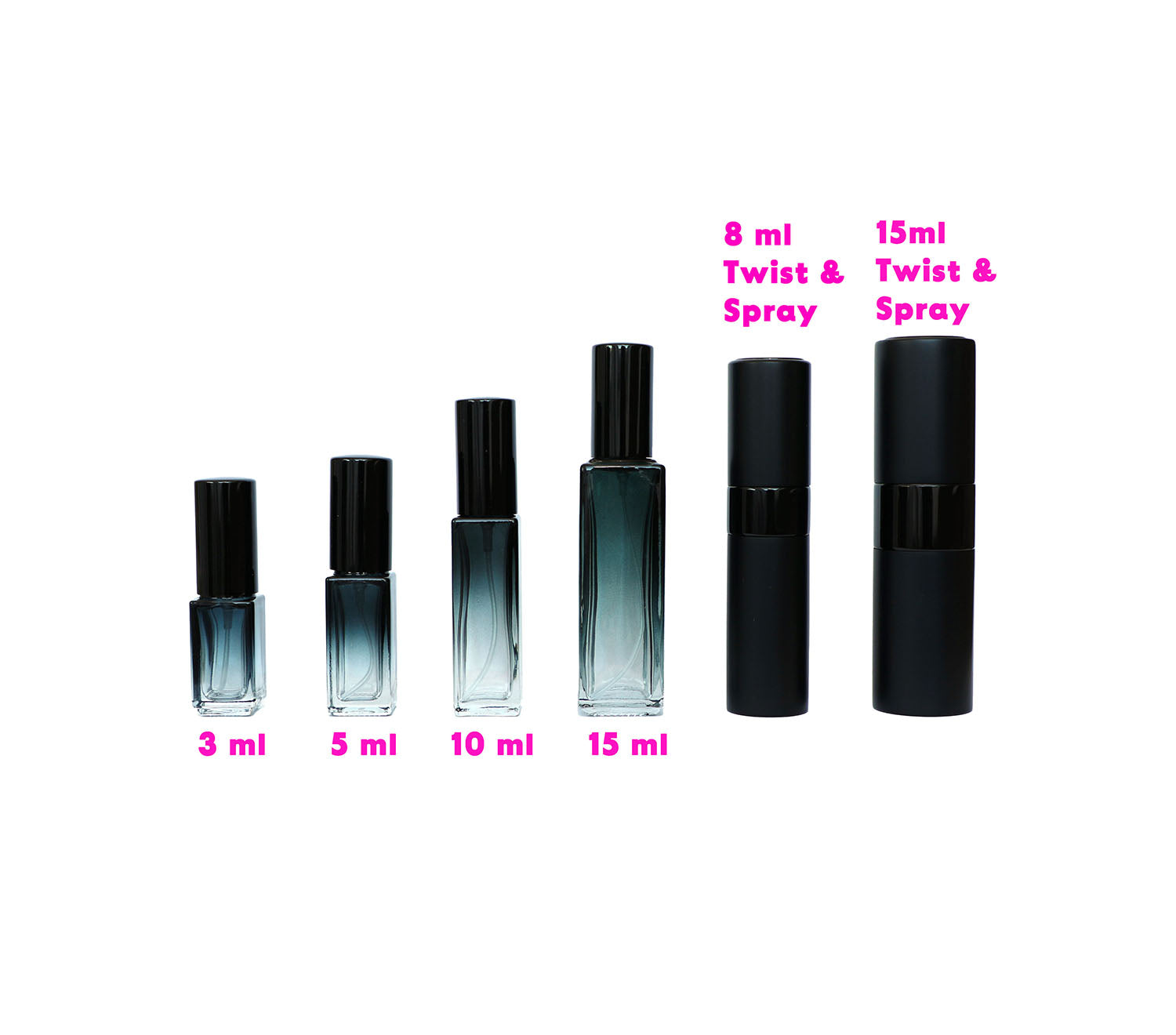 Fragrances are supplied in spray bottles, as shown in the image gallery. Scroll or swipe to view. Our bottles are available in 3 ml, 5 ml, 8 ml Twist & Spray, 10 ml, 15 ml Twist & Spray, and 20 ml spray sample sizes.